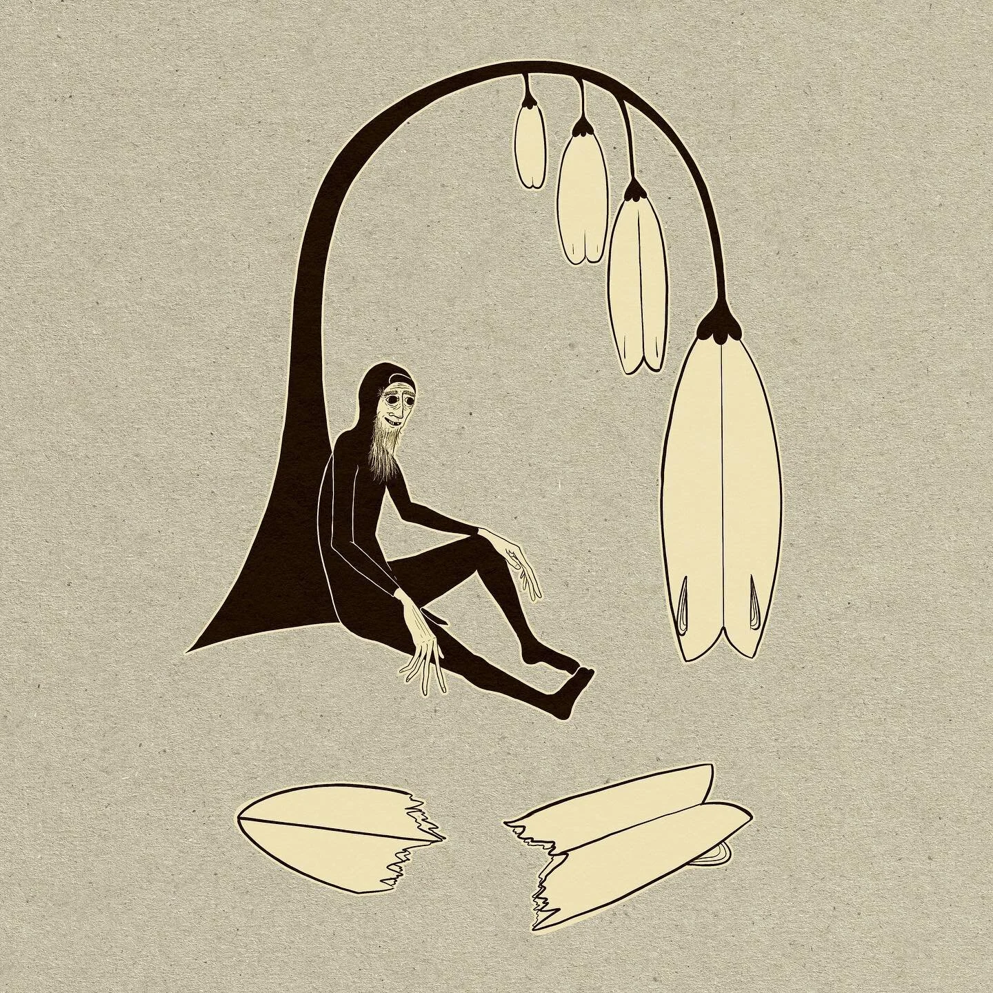 Knoffy’s suited figures navigate seas of emotion, their expressions capturing the fleeting feelings of life. His characters evoke the psychological side of surfing, who, while responding to the dynamic condition of the ocean, are full of whimsy and humor.